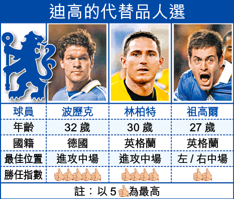 林柏特與約翰米基爾近期一直與廸高並肩,故不算其代替品;要找踢法最類似廸高的,其實已是巴塞的沙維。若談車路士現有人選,波歷克應是最佳「代替品」,其助攻力雖不及廸高,惟入球能力更勝一籌,由他夥拍林柏特及約翰米基爾,效果料最好。若史高拉利不變陣維持5人中場,不起用波歷克的話,祖高爾尚且可擺放中路,惟此子側擊確實較強。但由於是役車路士有前鋒杜奧巴復出,史高拉利亦可選擇排4-4-2陣式,從而解決廸高缺陣的問題。