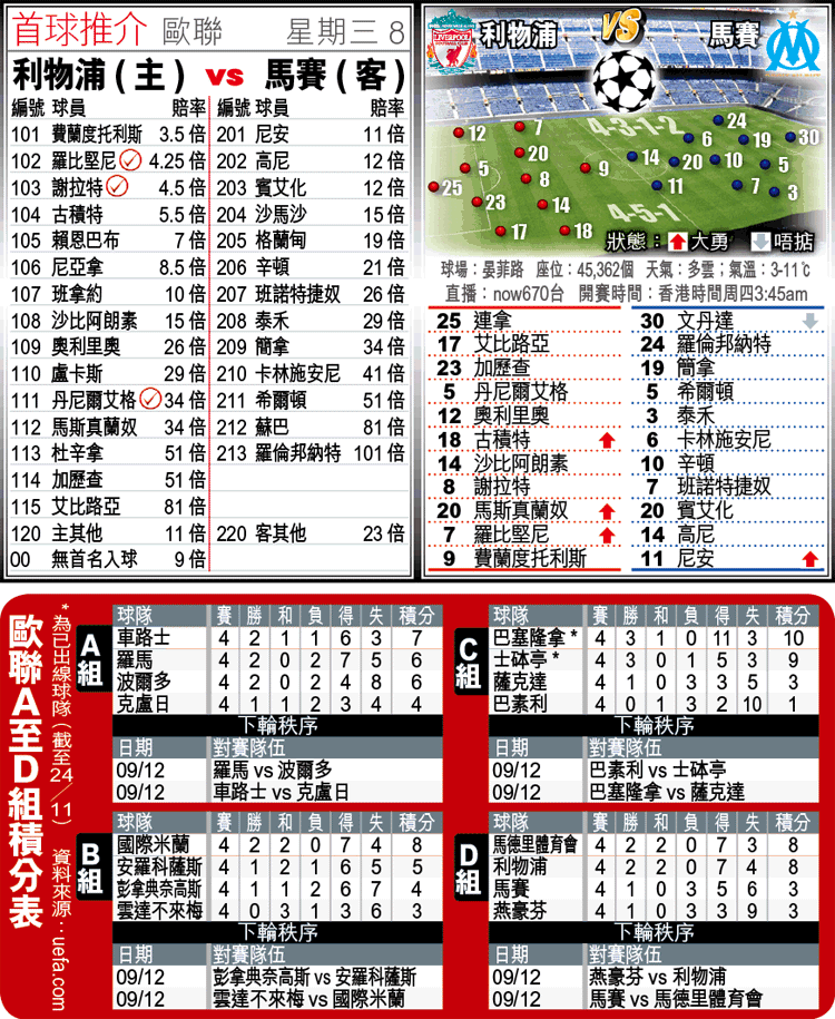 馬賽4戰僅得3分,要保出線希望,今訪利物浦就非勝不可,故料要打進攻足球,後防亦因而變得空虛。事實上,他們防守差勁,眾守將包括門將文丹達、中堅希爾頓及左閘泰禾等都有頗多甩漏,連國內外盃賽及聯賽在內,22場比賽失28球,恐難抵擋利物浦的進襲。此外,雖說他們前線幾名球員如尼安、高尼及賓艾化等都具入球能力,惟在列貝利及拿斯尼先後離隊後,現時鋒力不及對上兩季卻是不爭的事實。