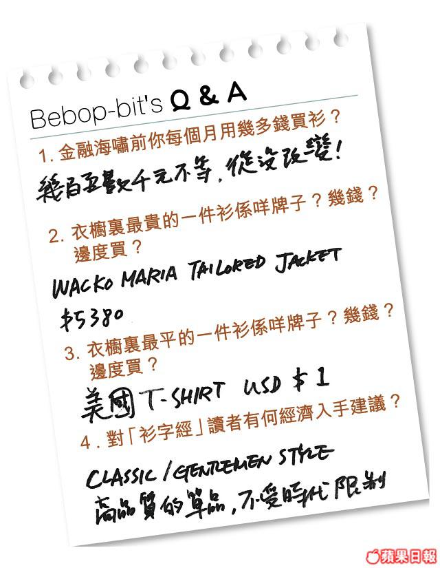講起衫,Bebop-bit亦有某種癖好︰「我好鍾意熨衫同摺衫,熨衫嘅時候我會有一種好平靜嘅感覺,個腦喺呢段時間係無諗過嘢,無形中係會幫助消減咗啲壓力。而摺衫我就好鍾意摺到一棟棟,好整齊亁淨咁樣。」果然風格獨特。
