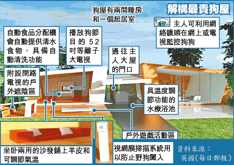 狗屋還有私家花園和52吋等離子大電視,先進的視網膜掃描系統防止野狗闖入,狗狗肚餓時可透過自動食物分配機送出食物,玩累了更可跳到水療浴池浸一浸,對皮毛很有益。