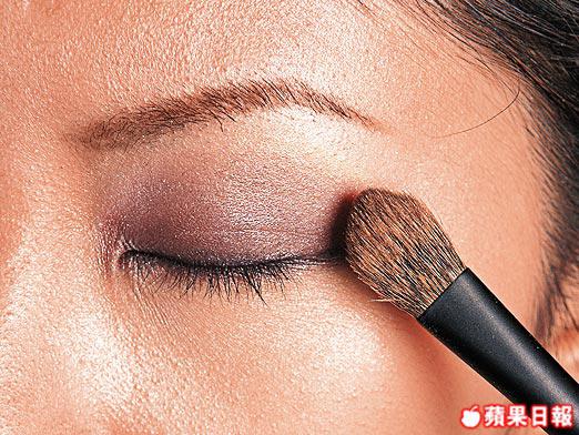 將深啡色眼影範圍擴大至整個眼窩,然後分別將啡紅眼影及淺色眼影加在眼頭及眉骨位,營造李嘉欣深邃大眼效果。