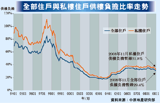 李志成說:「去年銀行多次減息早已造成供平過租的情況,雖然近3個月整體租金下調約20%,有不少新式屋苑的租金已回到07年初的租金水平,但在買賣呎價同樣下跌的情況下,租金回報率處於4厘,仍能保持供平過租的局面,加上減息令業主的負擔比率下調至約30%,令業主供款更為輕鬆,易於入市。」