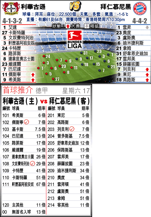 拜仁慕尼黑近況雖好,但防線仍問題多多,加上周中在歐聯搏殺完,故周六於德甲作客利華古遜,沒有贏波把握,平手當取主隊利華古遜,兼取入球「大」。(球賽編號:星期六17;有線61及64台今日10:30pm直播)