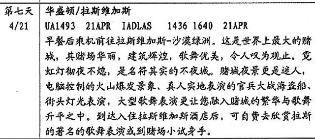 旅遊活動:共17日,包括3日夏威夷威基基海灘、火山口;3日洛杉磯環球影城、荷李活;2日拉斯維加斯各大賭場;2日水牛城尼亞加拉大瀑布;3日紐約的自由神像遊船、世貿廣場遺址;1日華盛頓白宮、國會山莊、林肯紀念堂;3日三藩市金門橋、漁人碼頭、唐人街