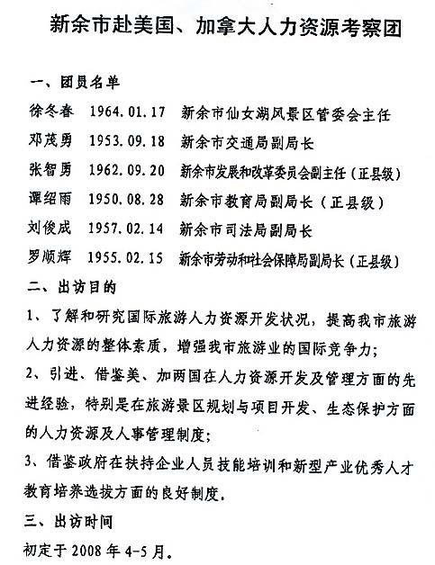 另一個溫州的培訓團,文件顯示23名團員均是當地各局各縣的主要官員,聲稱要「考察美國政府行政管理經驗,如何扶持溫州企業發展」,但行程中卻只有四日是公務、培訓,其餘時間與新余市考察團相若,均是在各城市主要景點遊覽。