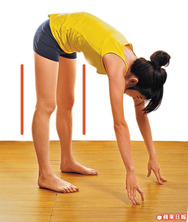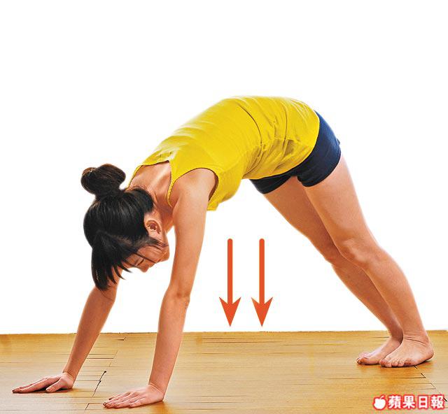 2.然後保持雙腳挺直,向前彎身,手指分開撐地。