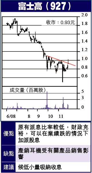 富士高現價93仙,預期PE在3至4倍之間,息率達16厘至19厘,是支持股價上升的原因,但近期升幅大,交投不活,只宜候低小量吸納收息。