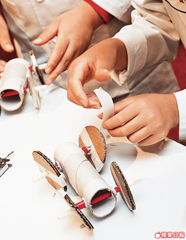 1.把太陽能板和小型摩打的電線相接,再用皺紋膠紙把摩打紮在木筷子的一端,貼在車身。