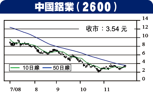 必和必拓放棄收購力拓屬利好消息,因為必和必拓若吞併力拓,將壟斷環球鐵礦石市場,令中國的鐵礦企業喪失在國際市場的議價能力,這次放棄收購,造就中鋁母公司增持力拓股權的機會。鋁價今年已多次下調,預期將於明年中回升。鋁鋼材業出口退稅將獲提高亦是利好。可在3.25元吸入,目標4元,破2.80元止蝕。