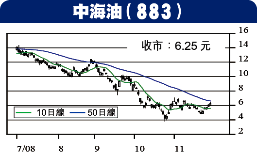 早前市場憂慮經濟不景令石油需求放緩,中海油遭拋售,不過內地早前傳出會取消暴利稅,市場憧憬內地油股盈利增加,加上中海油沒有參與下游業務,比其他同業有優勢。油價在各國決定減產後出現支持,加上中國對石油的需求正在穩定地增長,建議投資者待股價回落至5.90元投機性買入,目標6.50元,5.50元止蝕。