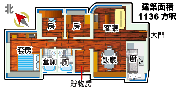 建築面積:1136方呎