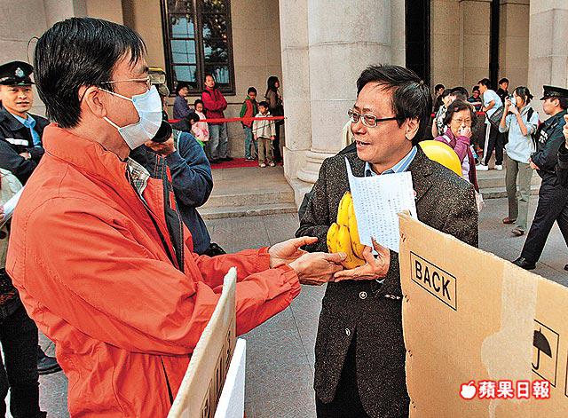 立法會噚日舉行開放日,主席曾鈺成初嘗做「伴遊」滋味,第一次以主席身份帶領市民參觀立法會大樓。噚日冇人問佢係咪中共黨員,大家最有興趣始終係毓民掟蕉事件。曾鈺成身為主人家,七情上面「案件重演」,作狀示範當日事發經過,又話如果日後再有議員掟蕉,就會請佢離場。