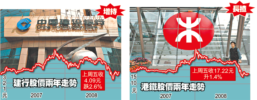 受金融海嘯及外圍經濟轉差拖累,劉女士手持的股票,包括港鐵(066)、國航(753)及建行(939),賬面金額已虧蝕2.6萬元。陳榮肇指,港鐵及建行長遠可看高一線,因前者持有優質地皮,甚具發展潛力,而沙中及港島未來的地鐵沿線,亦會為港鐵帶來可觀盈利。