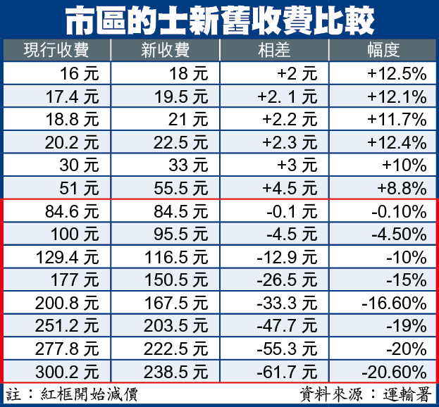 短加長減新收費是落旗16元加至18元,之後每跳由1.4加至1.5元,到新收費的70.5元起減為每跳1元。運輸署前晚起向的士業派發新舊收費對照表,顯示現行收費84.6元以下都有增加收費,例如現行20.2元,加2.3元;現行30元,加3元;現行51元,加4.5元。