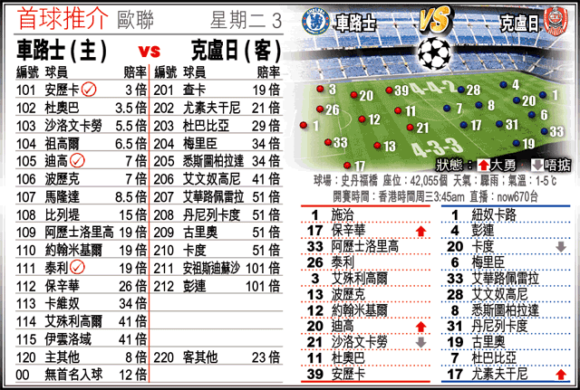 車路士周二主場面對克盧日的歐聯A組出線關鍵戰;以車仔領隊史高拉利已將前途押上,就算有林柏特停賽,憑大勇的安歷卡及廸高,亦足以大炒踢風流波的克盧日,「讓球主客和」「主勝」可重心出擊。