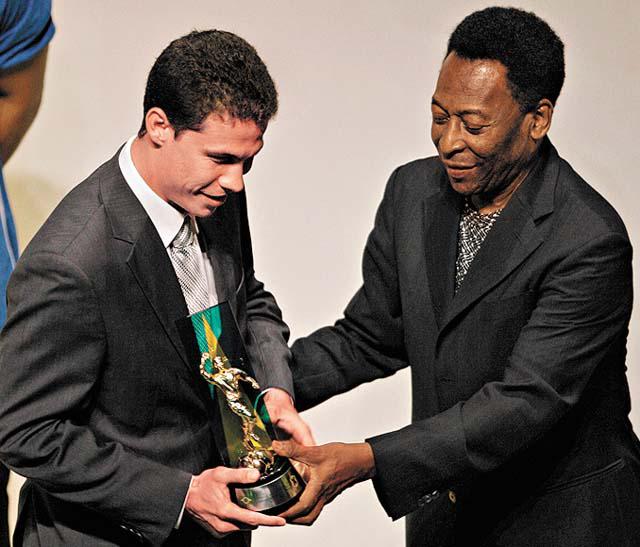08巴甲聯頒獎典禮周一舉行,聖保羅門將兼隊長羅渣里奧(左圖右)舉起聯賽冠軍獎盃;球王比利(右圖右)則將最佳球員獎,頒給聖保羅的靴蘭尼斯(右圖左)。美聯社