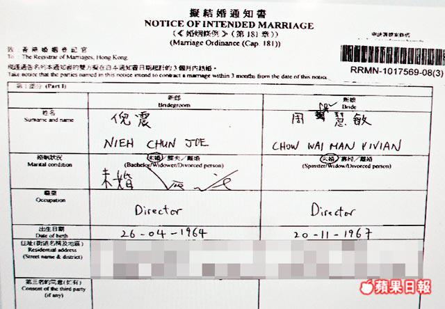 倪震和周慧敏的擬結婚通知書上清楚列明二人乃前日入紙,職業同樣報稱為Director(董事),住址同樣填上北角丹拿道,而不是周慧敏位於跑馬地的金山花園。根據婚姻登記處工作人員表示:「若果噚日入紙登記,新人最快明年1月3號結婚,3個月內唔結嘅話,通知書作廢,要重新申請。」
