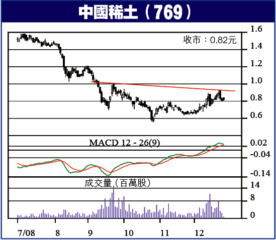 中國稀土(769)係一隻冇點升過嘅股票,10月底雖然跌到落0.56元,但只係兩三日時間,過去幾個月,大多在0.65元至0.80元間上落,近日曾衝上0.90元後又回軟,落番0.80元水平,又可趁低吸入,中線持有,博重上1.20元。