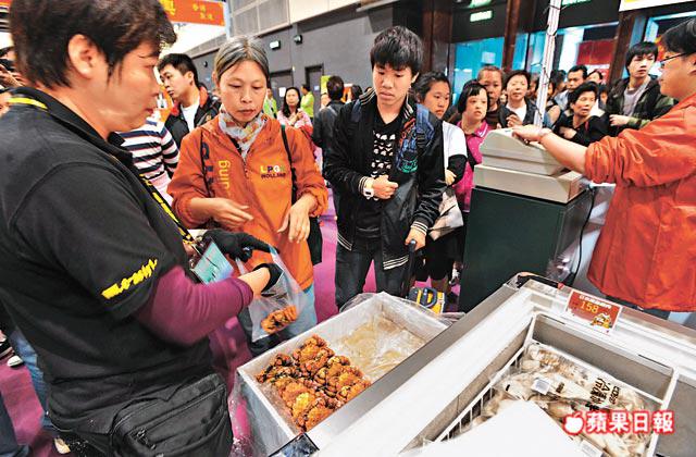 食品:栗毛蟹每隻48元;冰鮮蠔每包150元;帶子每包128元;日本米酒真澄720ml,售價210元