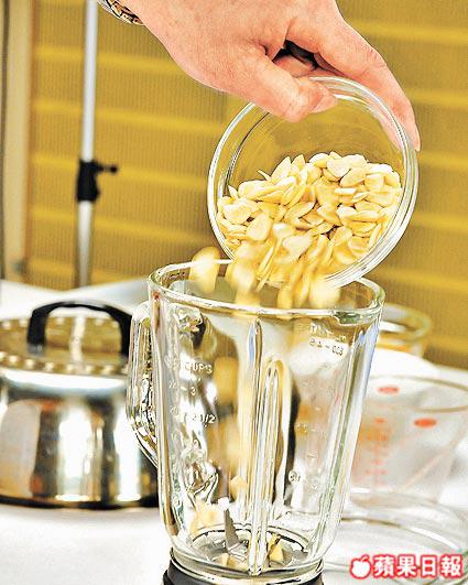2.將杏仁倒入攪拌機,打成茸,隔渣倒入煲煮滾,下砂糖、生粉水拌勻,最後下花奶拌勻。