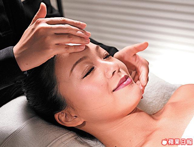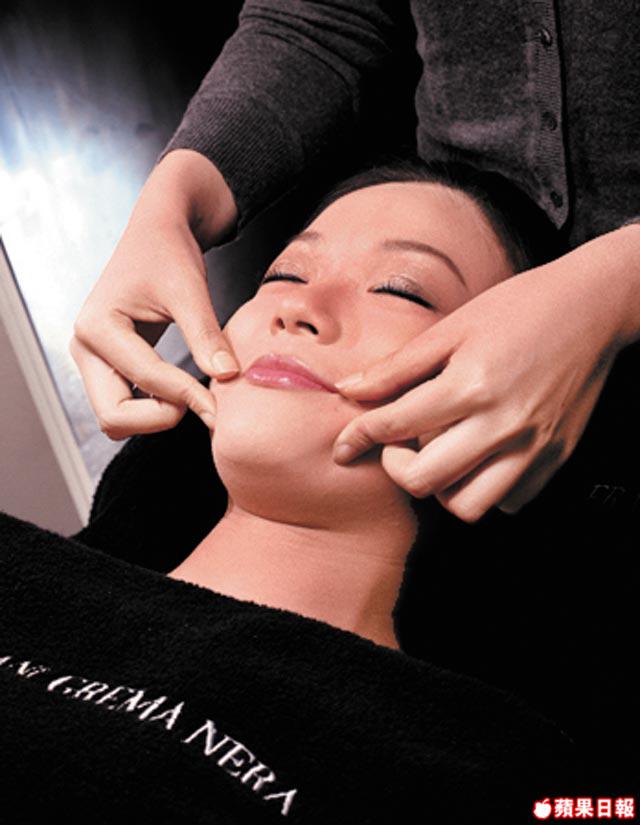 先按摩舒緩及清潔。然後全面塗上精華素,配合搣的按摩手法,把精華導入,有抗衰老作用。