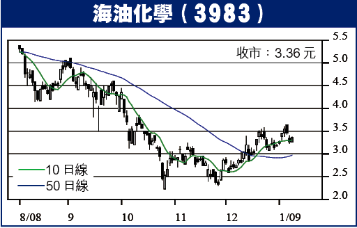 海油化學08年度預計巿盈率約8倍,估值吸引,投資者不妨候股價回落至3元附近吸納,中線目標3.65元,止蝕2.75元。