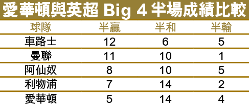 曼聯在今季英超聯踢了22場比賽,贏了15場,贏波數場乃各隊之冠,但是,原來他們於半場和波多,而且常常沒有入球。至於愛華頓於半場表現硬淨,23場僅失8球及輸4場。