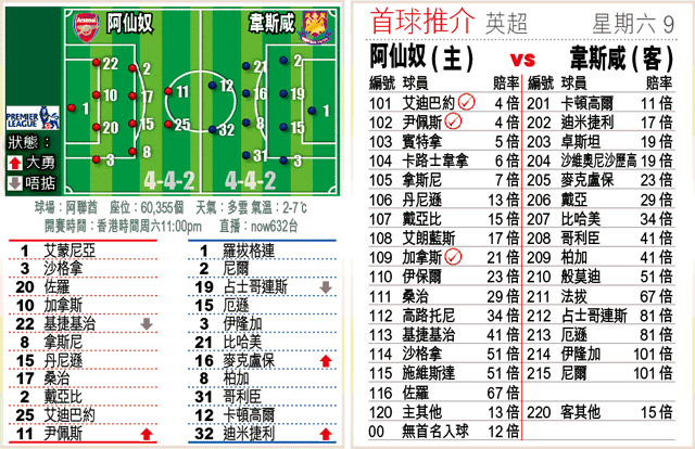 周六英超展開倫敦打吡戰;阿仙奴雖然連和兩場,但以阿聯酋主場威力,加上大勇的射手尹佩斯,有望助主隊重拾勝軌,今迎已7場不敗的「槌仔幫」韋斯咸,「讓球主客和」照捧[-1]的「主勝」。