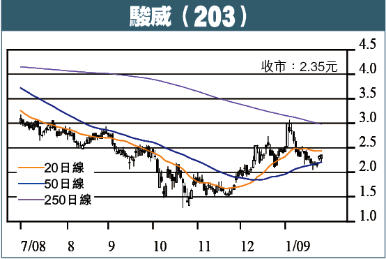 駿威(203)昨收2.35元,升1.29%,股價於月初升至3.06元高位,受制於250日線回落,近日力守50及100日線支持位,這兩天重返10日線之上,成交回升,下周初有機會挑戰位處2.43元的20日線,破位可再上試250日線(現處2.95元)。現價買入,以2.10元作止蝕位,股價上破2.45元收市,可加1注,加注後改以2.25元作計數位。