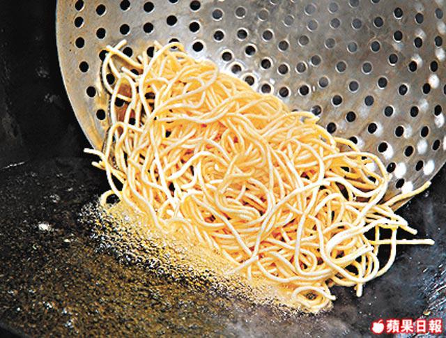1.陽春麵以大滾水煮40秒至七成熟,過冷河,以少許鹽及油拌勻,待10分鐘,再下大滾油炸1分鐘成炸麵餅備用。