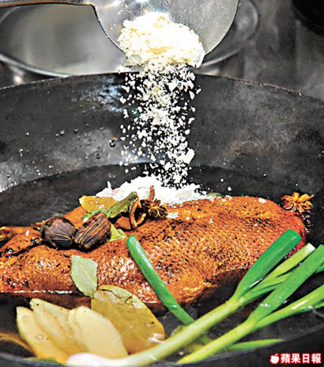 2.起鑊下葱、薑、八角、桂皮、香葉及草果略炒,加入其餘汁料,放入鴨,加水至蓋過鴨面,用大火煮滾後轉中火煮約50分鐘至全熟,取出鴨切件。
