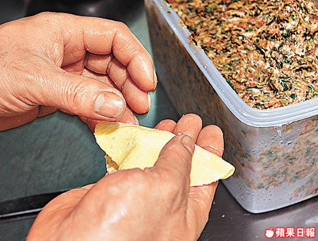 餡料:豬肉碎2両、薺菜葉碎/蝦肉各1/2両、鹽1/2茶匙