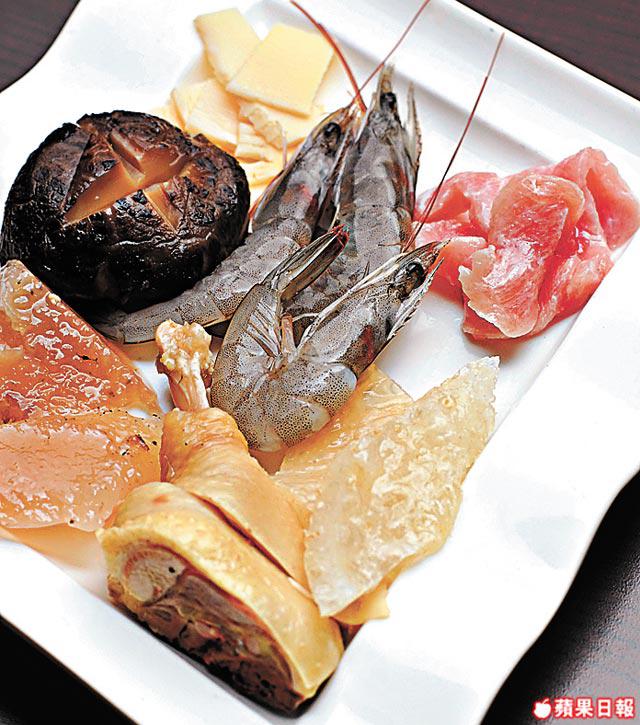 雲吞皮250克、白灼蝦2隻、紅燒海參1/2條、蠔汁扣冬菇2隻、蛋餃2隻、白切雞髀1隻、上湯500毫升