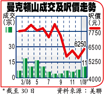 【本報訊】荔枝角曼克頓山早前出現首宗銀主盤成交後,成交量有逐步增加趨勢,連同大年初二出現的一宗成交,該屋苑本月已錄得11宗成交,為去年6月後成交量最多,平均呎價顯著回升13.3%至6250元,為金融海嘯後新高。