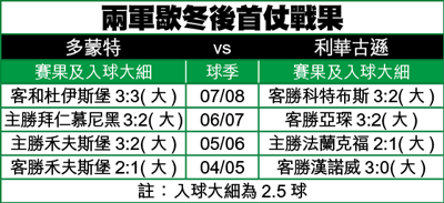 次循環德甲聯於本周重開,翻查歷史,多蒙特及利華古遜近季於歇冬後首場德甲聯,總是與對手合演入球秀(見附表),故今仗亦可考慮取1.62倍的入球「大」。