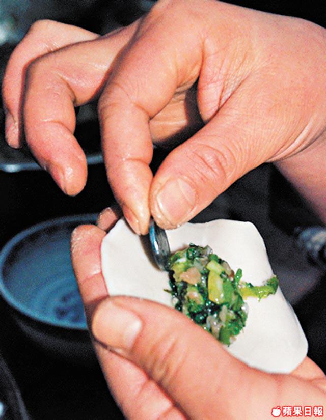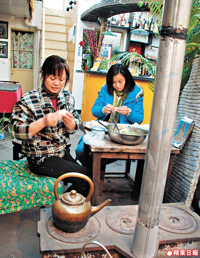 「來,我們包餃子吧!」喝過茶,阿姨拿出用白菜、豬肉製成的餡料及水餃皮,放在天井中央的小桌上。對北京人而言,餃子等同團圓,是不可或缺!就這樣,阿姨、在旅館工作的姑娘萬玲及我,就在木桌旁包餃子。阿姨邊包餃子邊說:「這兩天我們都會包餃子請客人吃!」時值北京-10℃,我卻感到絲絲人情暖,還有實牙實齒的暖氣!原來木桌旁放有傳統炭爐,用來燒水、取暖。在暖和氣氛下,她們忽然神秘兮兮,要我進廚房燒水,回頭,只見她們放了甚麼進餃子裏,難道像《獎門人》般想將wasabi放進餃子作弄人嗎?
