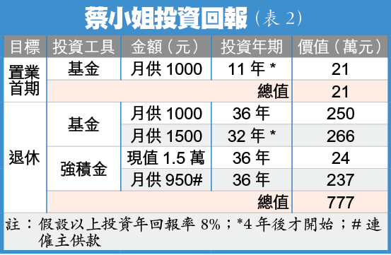 假如蔡小姐月剩3500元,首4年須每月儲1000元退休儲備、2500元進修學費。當完成學業後,扣除置業基金1000元,其餘1500元可加大月供基金投資,加上強積金,假設所有投資年回報率8%,60歲時估計有777萬元(表2),剛好符合最少退休準備金776萬元。