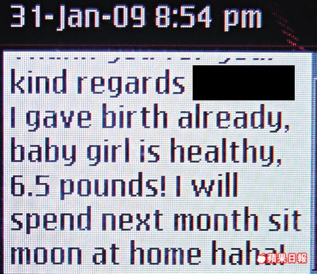 昨晚約9時,張燊悅親撰SMS向本報報喜,表示數日前誕下一名千金,重6.5磅,十分健康,因為選擇自然分娩,張燊悅表示產後十分疲累,故到昨晚才公佈喜訊。初為人母的張燊悅難掩喜悅之情,她寫道:「Igavebirthalready......6.5pounds!Iwillspendnextmonthsitmoonathomehaha.」(我已生了小孩……重6.5磅,會待在家中坐月,哈哈。)