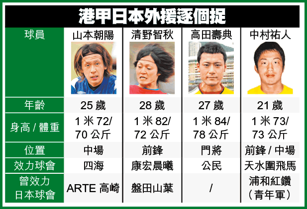 3名日本新援中,當然以清野智秋名氣最響,既曾入選日本U18及U19歲青年軍,之後更效力過日聯磐田山葉及日乙的靜岡FC。至於山本朝陽及中村祐人同樣是大學隊球員,惟在操練及友賽中亦證明有不俗個人能力。