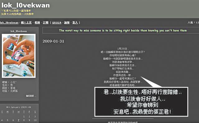 此外,芷君的網上日誌中有多人留言悼念,當中一名網名lok_l0vekwan的男子,相信是芷君的舊男友,他嘆息:「1月29日(車禍發生的一天),呢一日點解係我哋永遠永遠分開既日子?你知唔知道我有幾心痛?」芷君誤入歧途,直接或間接地踏上這趟不歸路。舊男友寄語:「以後要生性,唔好再行差踏錯……安息吧,我最愛的張芷君!」