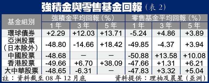 經歷金融海嘯後,比較強積金與零售基金的回報,前者略勝一籌。雖然兩者的股票組別,於過去一年均跌逾四成,但強積金5年期的平均回報表現較佳,如香港股票組別回報有38.09%,跑贏零售基金的6.21%;至於環球債券組別,過去1、3、5年的回報,亦較零售基金出色(表2)。