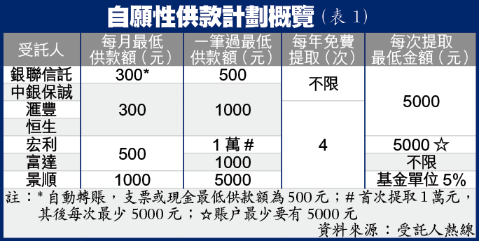 論門檻,月供基金入場費一般最少1000元,自願性供款就較低,當中滙豐、恒生、中銀保誠及銀聯信託可低至300元;一筆過買入則以銀聯信託最低,僅500元。由於額外自願性供款不同一般強積金供款,不會限定65歲時才可取回累算權益,可隨時提款,故一般受託人都容許計劃成員,每年可免費提取數次,銀聯信託及中銀保誠更不限提取次數。