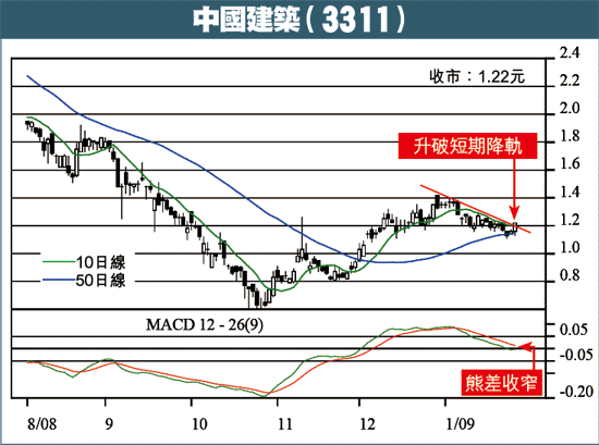 買賣策略:中國建築上周五升破降軌阻力,MACD熊差收窄,候1.17至1.24元吸納5萬股,短炒目標1.42元,跌穿1.10元止蝕。