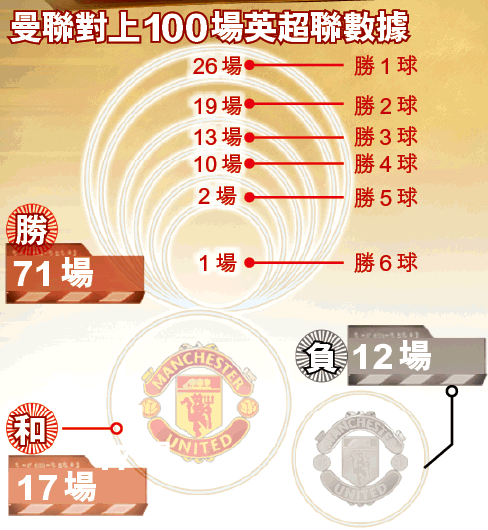 再談輸波場次,曼聯近100場聯賽僅輸過12場,不過全部同樣僅敗一球予對手。因此,冷吼曼聯輸波的球迷,切忌買0:2、1:3、0:3或更大比數敗陣的波膽,畢竟紅魔近100場聯賽未嘗淨負對手兩球或以上。
