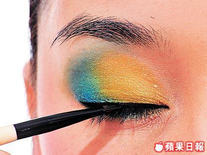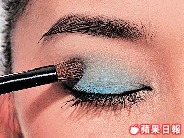 在眼窩位塗上灰藍色眼影#Cornflower作底色,然後在眼摺位搽上天藍色眼影#SeaFoam,下眼線位則可以塗上蛋黃色眼影#DayGlow,撞出對比效果。