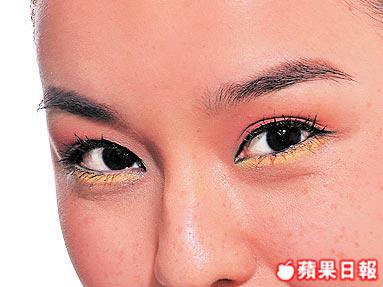帶紅的暖色系,大部份人怕將它搽在眼簾上會浮腫,其實只要不近眉,就能減少浮腫。先在眼簾搽上淡橙色#Coral,在貼近眼線位搽上橙色#HoneyBell,最後在下眼線位塗上粉黃色#DayGlow,眼睛顯得更明亮。