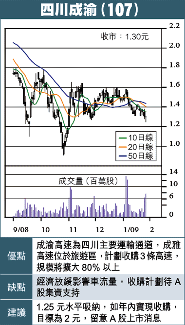07年底,成渝已申請發行A股5億股,集資不多於20億元,去年中已獲中證監審核通過,不過市場狀況急轉直下,目前仍未獲批准發行。上述集資,計劃以其中10億元收購成樂高速,由於A股未能發行,至今仍未收購。其餘的收購計劃,還有遂渝高速四川段,以及成南高速,已計劃於今年底前完成收購,相信也是等候A股上市集資。