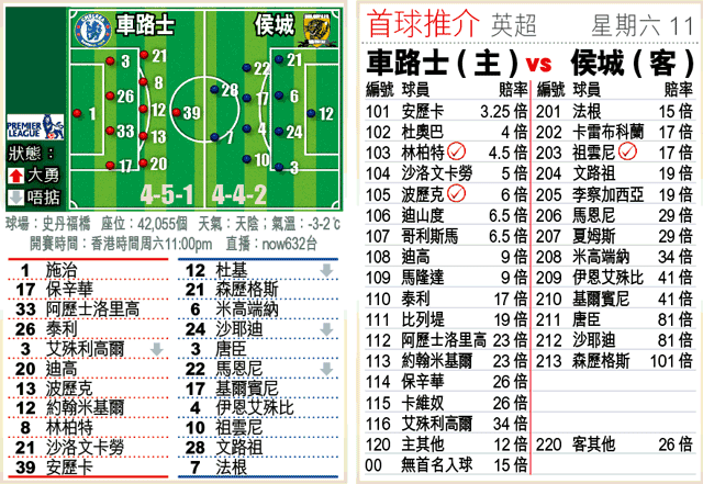 車路士vs侯城(now632台直播)
