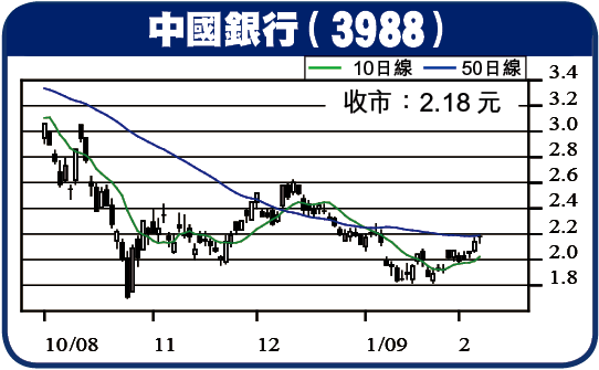 去年在人民幣公司貸款市場提高市場佔有率0.6個百分點,全年錄得新增人民幣公司貸款2626億元人民幣。受惠於去年11月份開始國內新增貸款全面回升,同時可望成功爭取較低風險的基礎設施項目和大型企業貸款市場佔有率。策略投資者套現後,短線下跌風險有限。可於2.10元吸納,上望2.40元,破1.85元止蝕。