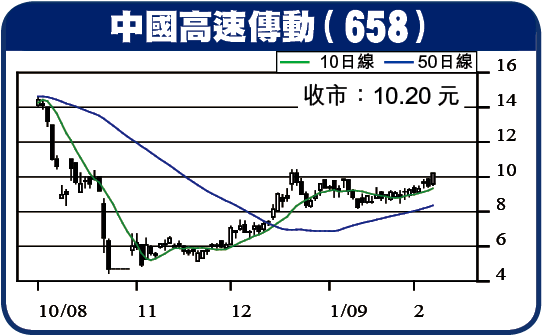 上月發盈喜,指受惠於出售CDMA業務及資產而錄得一次性收益入賬。雖然其推出內地3G服務時間相較對手為慢,不過其網絡制式已經成熟,手機配套及增值服務支援亦會較多,可從後趕上。股價在多年低位徘徊超過一周後,上周五呈突破,料近期中資股表現轉佳下,應有力再向上,建議7.30元買入,目標8.20元,穿7元止蝕。